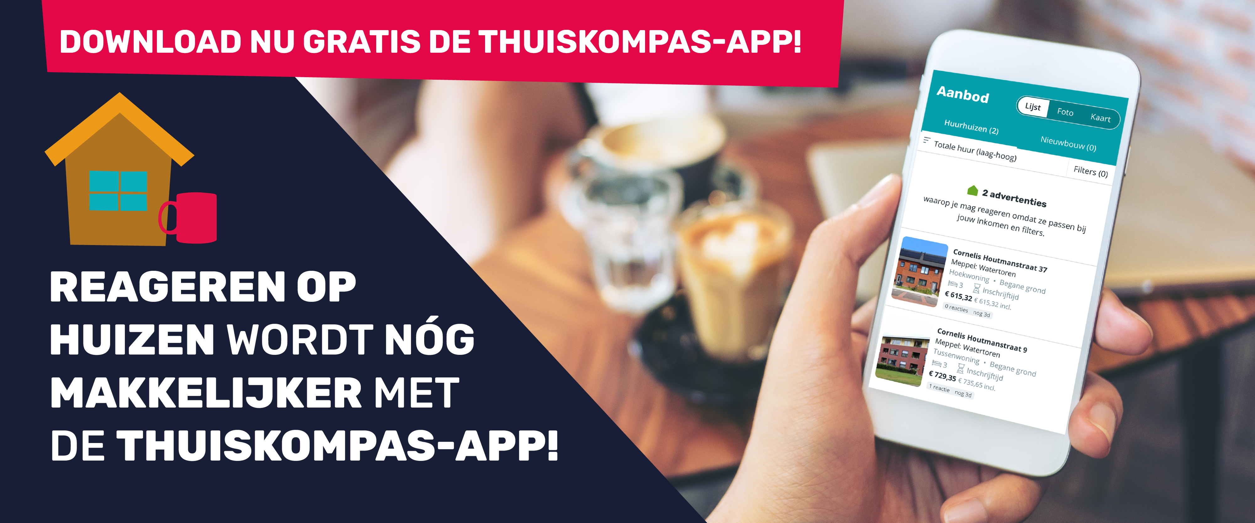 Goed nieuws voor alle woningzoekenden in Drenthe! Thuiskompas is nu ook beschikbaar als app op je telefoon of tablet. Of je nu thuis op de bank zit of onderweg bent. Met de Thuiskompas-app kan je altijd en gemakkelijk op een woning reageren.